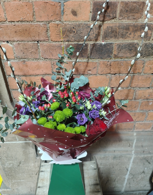 Ruby is a beautiful selection of seasonal flowers in deep reds and purples with lush foliages presented in Christmas cello and gift box in its own water bubble.
